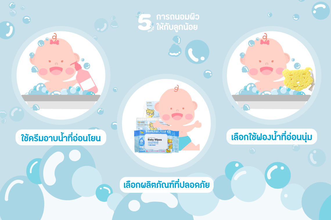 3. ใช้สบู่หรือครีมอาบน้ำที่อ่อนโยน การอาบน้ำโดยใช้สบู่ธรรมดาอาจทำให้ ผิวของลูกแห้ง แตก ลอกได้ ทางที่ดีควรใช้สบู่หรือครีมอาบน้ำสำหรับเด็กที่มีสูตรอ่อนโยนต่อสภาพผิว
