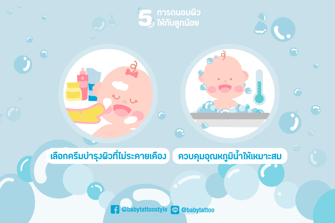 4. ควบคุมอุณหภูมิน้ำให้เหมาะสม การอาบน้ำให้ลูกน้อย ไม่ควรอาบด้วยอุณหภูมิร้อนหรือเย็นจนเกินไปควรอาบน้ำให้ลูกด้วยอุณหภูมิอุ่นพอดี จะช่วยทำให้ลูกน้อยผ่อนคลาย ผิวไม่แห้งกร้าน สบายตัวมากยิ่งขึ้น