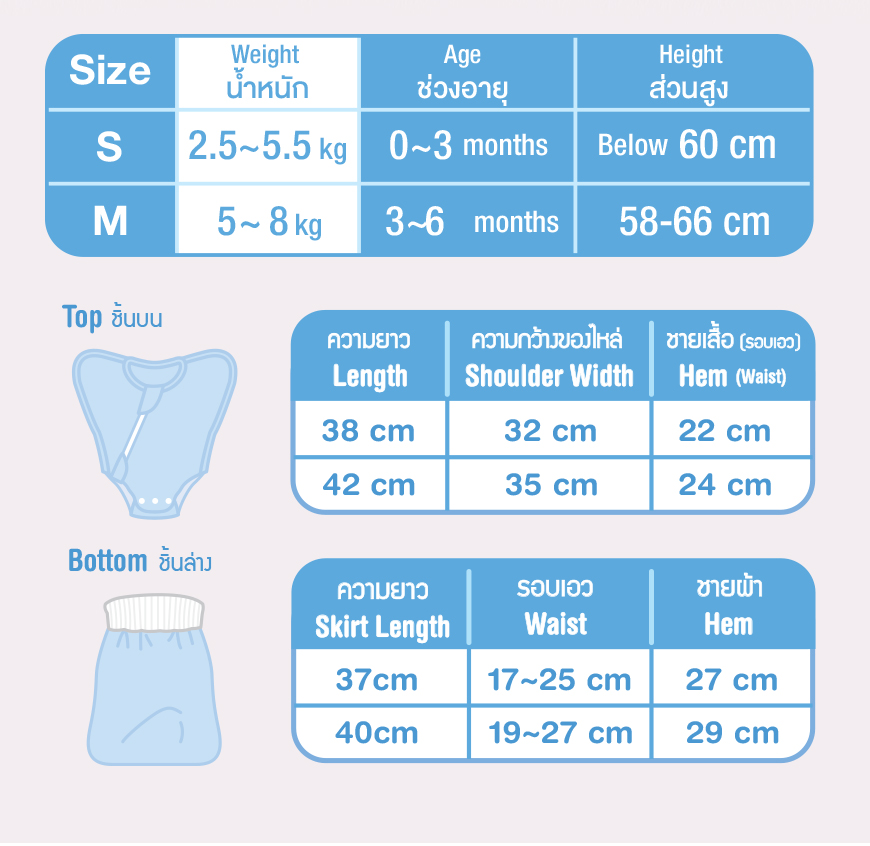 ส่วนชิ้นล่าง : ความยาว 40 ซม. / รอบเอว 19-27 ซม. / ชายผ้า 29 ซม.