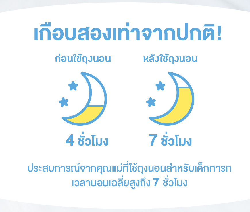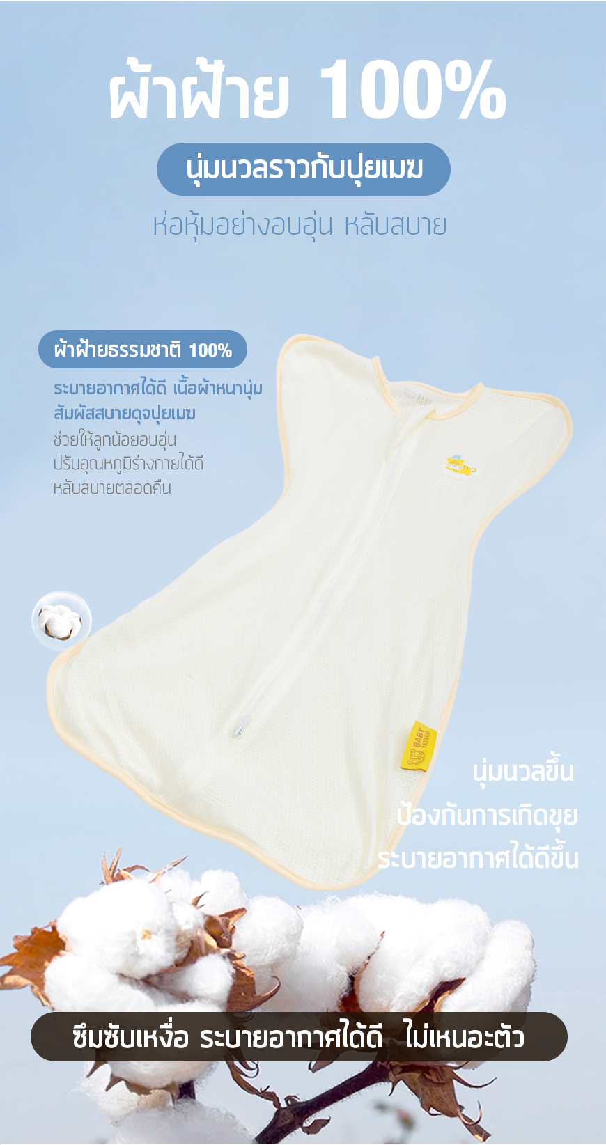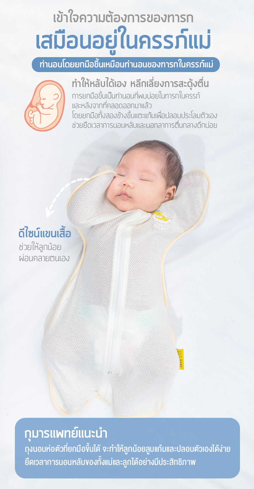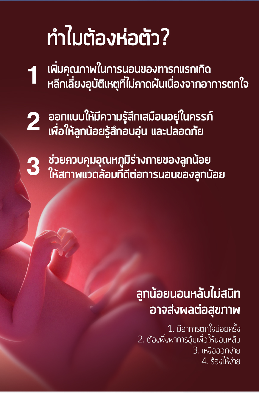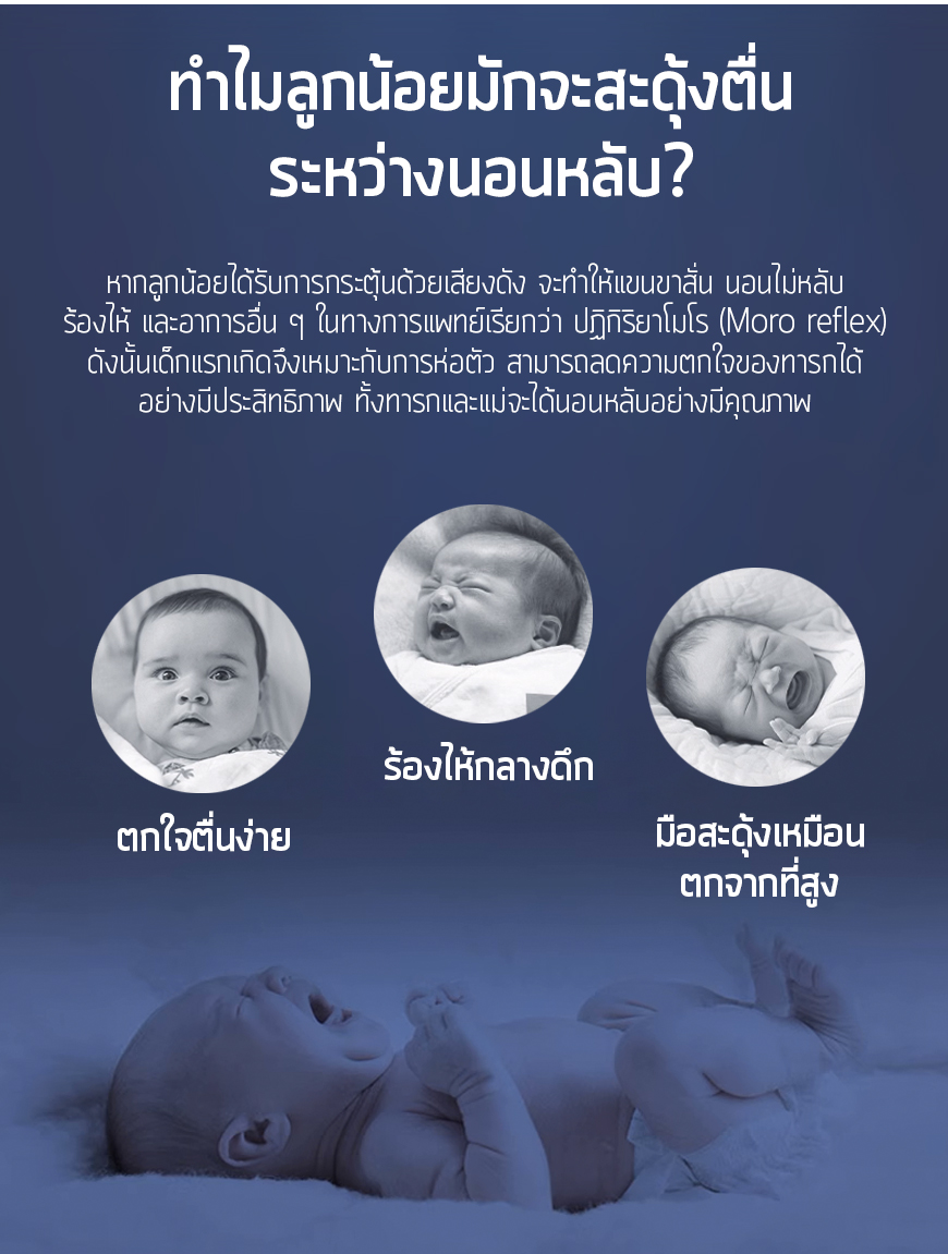 - ช่วยห่อตัว ลดอาการสะดุ้ง (Moro Reflex) รู้สึกปลอดภัยเหมือนอยู่ในครรภ์แม่