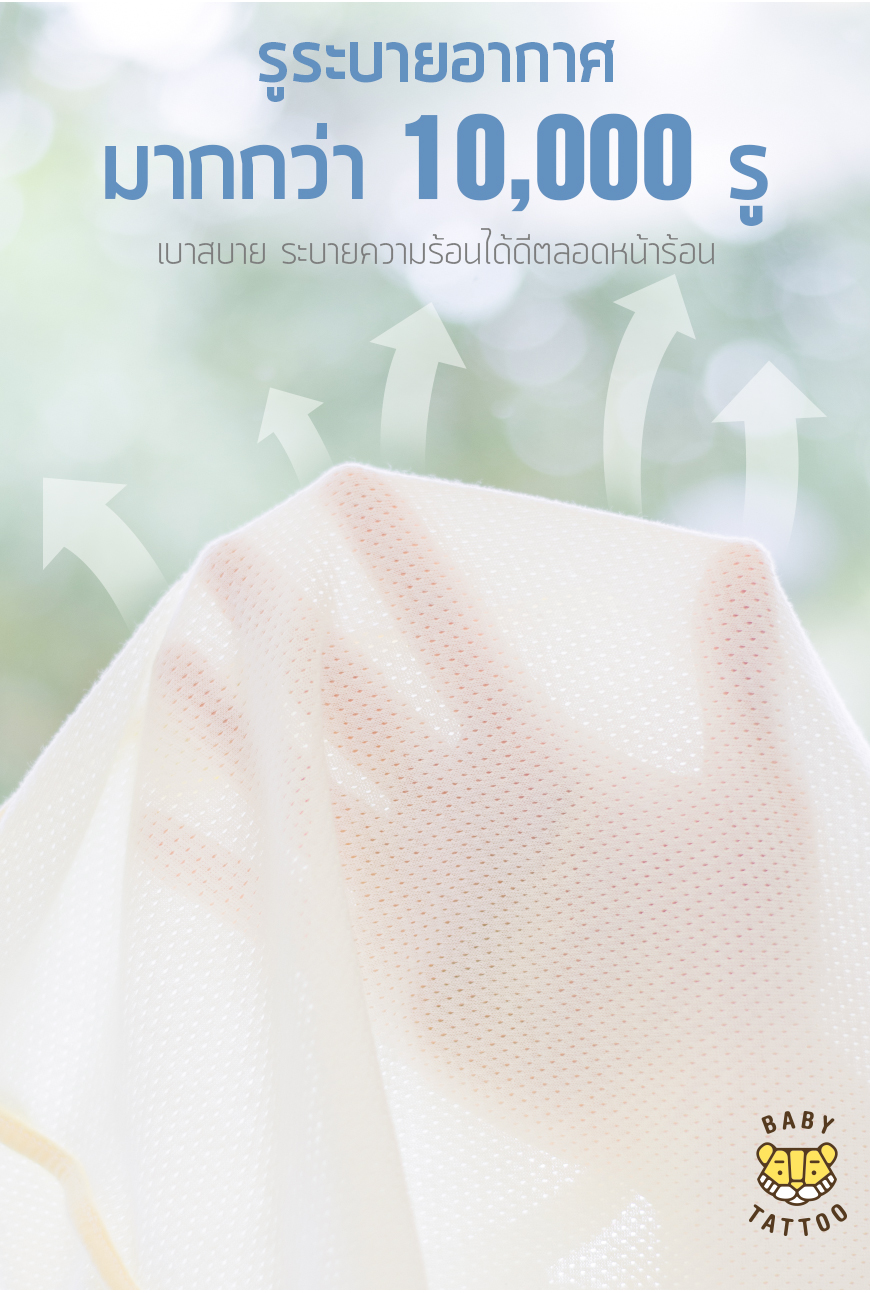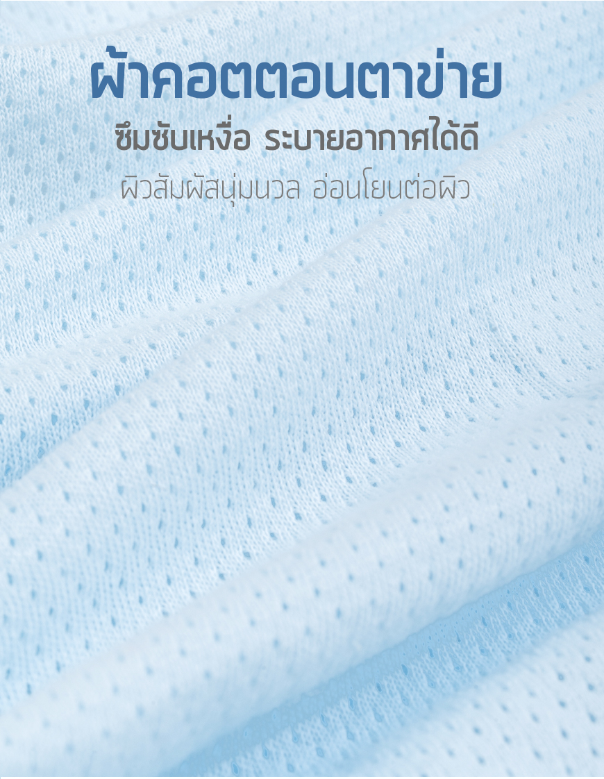 - ผ้าฝ้ายตาข่าย ช่วยเพิ่มช่องว่างให้ลมผ่าน ทำให้ระบายอากาศได้ดีกว่าคอตตอนทั่วไป