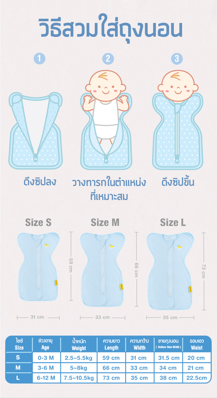 Size M : ช่วงอายุ 3-6 เดือน / น้ำหนัก 5-8 kg / ความยาว 66 cm / ความกว้าง 33 cm / ชายถุงนอน 34 cm / รอบเอว 21 cm